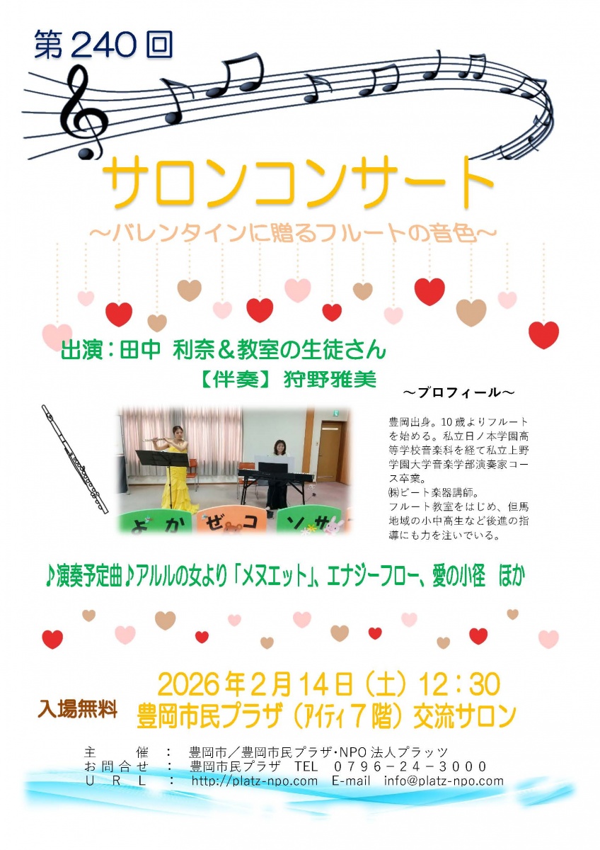 « すべてのイベント 第240回サロンコンサート 2月 14 @ 12:30 PM - 1:30 PM イベント ナビゲーション « 〔ほっとステージご予約〕個人演説会 〔ほっとステージご予約〕入学説明会 » 日時:2026年 2月14日(土) 12:30~ 場所:豊岡市民プラザ 交流サロン 出演:田中利奈&教室の生徒さん ♪演奏予定曲♪アルルの女より「メヌエット」、エナジーフロー、愛の小径 ほか + Google カレンダー+ iCal エクスポート 詳細 日付: 2月 14 時間: 12:30 PM - 1:30 PM イベントカテゴリー: これからの催し(サロンコンサート), これからの催し(全て) 主催者 NPO法人プラッツ 電話番号: 0796-24-3000 メール: info@platz-npo.com 会場 豊岡市民プラザ 大手町4-5 アイティ7F 豊岡市, 兵庫県 6680031 Japan + Google マップ 電話番号: 0796243000 Web サイト: http://platz-npo.com/